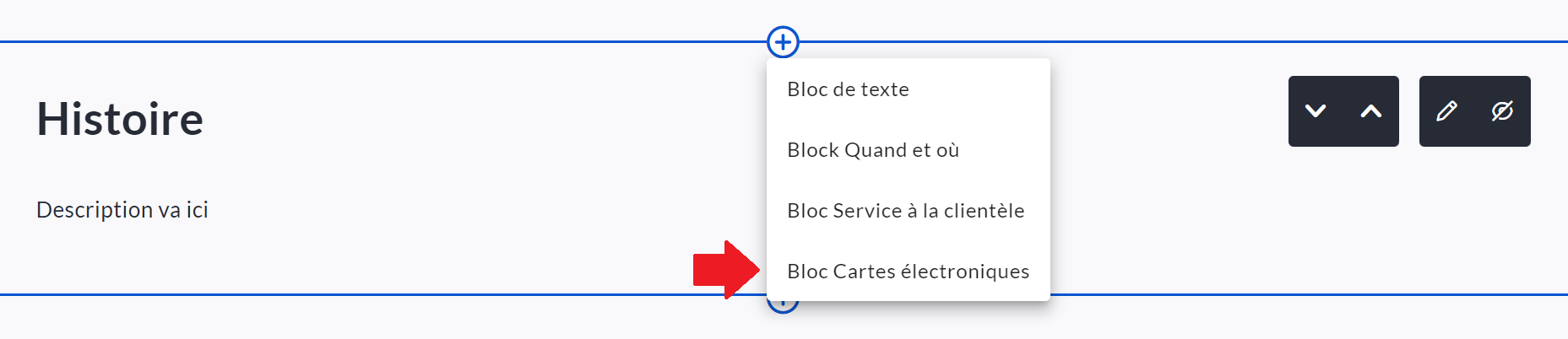 3. Faites défiler l'écran vers le bas, passez la souris sur un bloc existant et cliquez sur l'icône « + ».