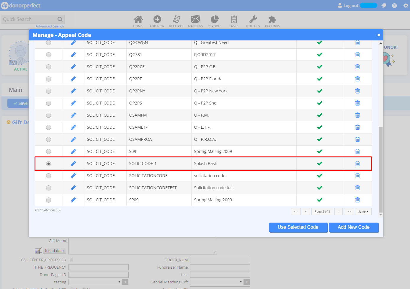 Il peut être mis à jour ultérieurement en cliquant sur « Gérer les codes » dans DonorPerfect :